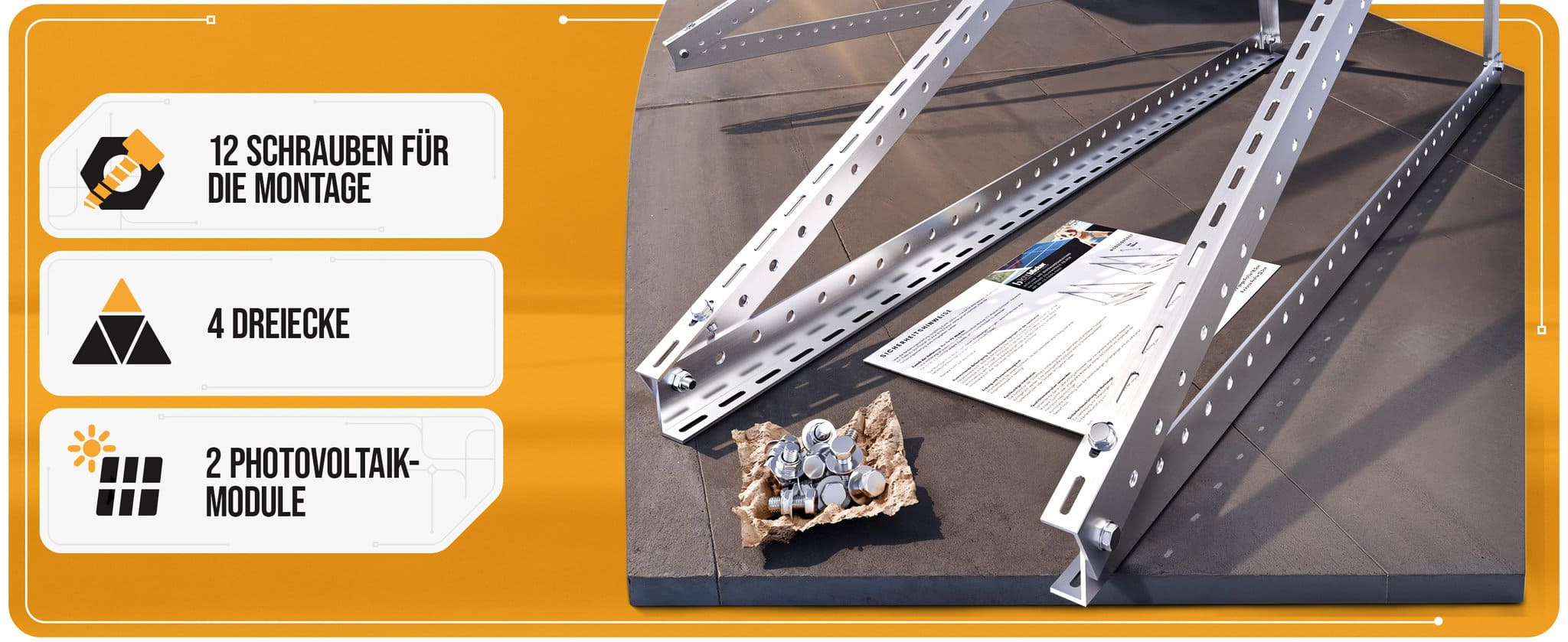 Der Lieferumfang ist für die Montage von 2 Stück Photovoltaikmodulen ausgelegt: