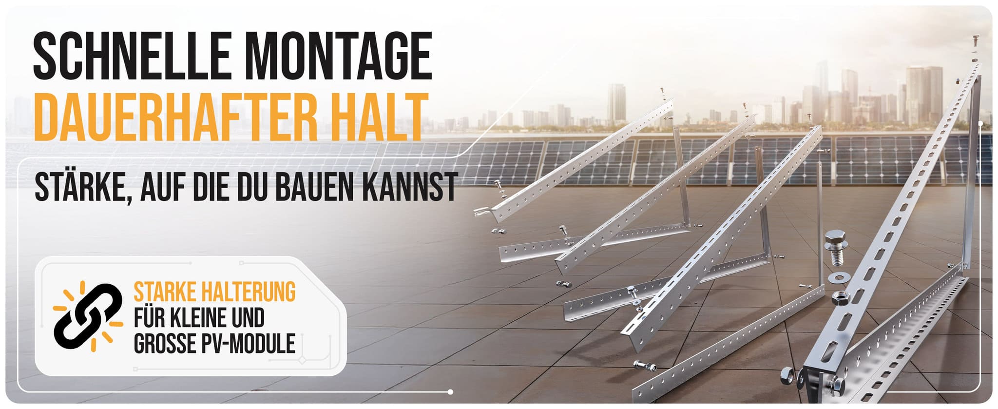 Unsere Halterungen bestehen aus 3 mm starken Aluminiumprofilen und wiegen ca. 6 kg (pro Paket) – das sorgt für Stabilität und ein wertiges Erscheinungsbild. Bei einem Neigungswinkel von 30° sind sie mit bis zu 200 kg belastbar – ideal für unterschiedlichste Einsatzbereiche und Witterungen.