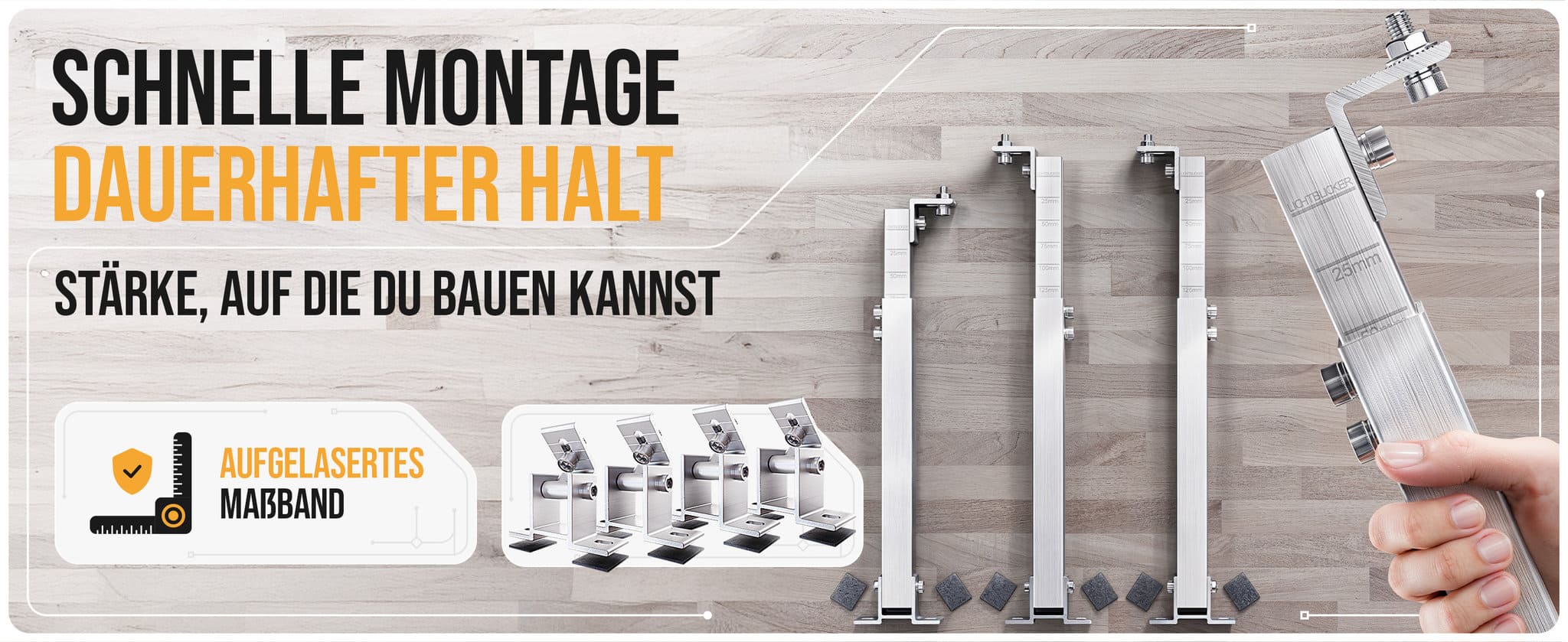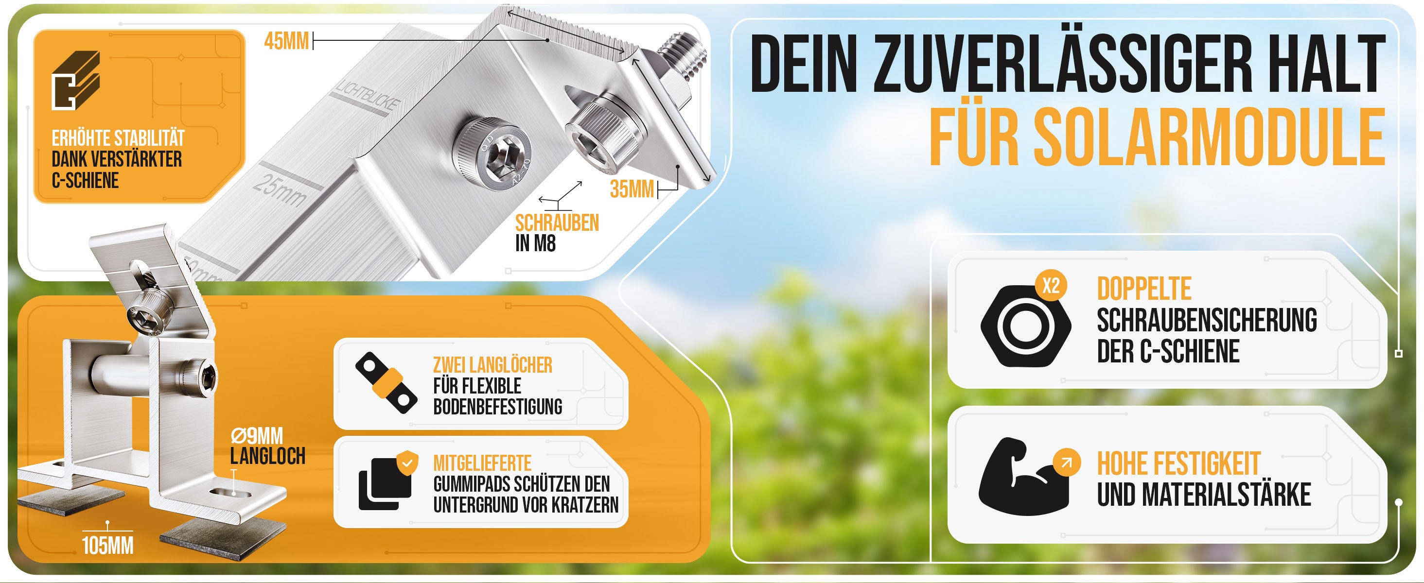 Hochwertige Edelstahlschrauben und doppelte Gleitmuttern sorgen für maximale Stabilität und Langlebigkeit. Ein aufgelasertes Maßband erleichtert die parallele und gleichmäßige Ausrichtung der Module.